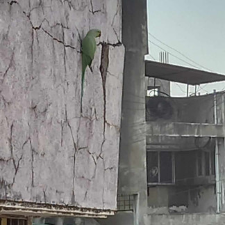 Pictured below are Rose-ringed Parakeets (or Indian ringneck parrots) that I was fortunate to snap on a hot afternoon in my mother's hometown Surat in Gujarat while visiting my Grandmother. These cheeky parrots are not shy and flock to the apartment complex and can be found chattering away near the temples close to my grandmother's house! They are well adapted to urban life often perched on the side of building walls. Throughout Indian history, these birds have been highly regarded in society and admired for their striking plumage and characteristics.